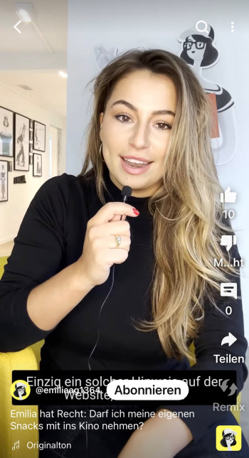 Darf ich meine eigenen Snacks mit ins Kino nehmen? Bei Emilia kämpfen erfahrene Rechtsschutz Expert:innen für Ihre Rechte. Mit kurzen Videos auf YouTube und TikTok antworten die Jurist:innen und Anwält:innen von Emilia Rechtsschutz auf die gängigsten Fragen, wenn es um das Thema “Recht im Alltag” geht.