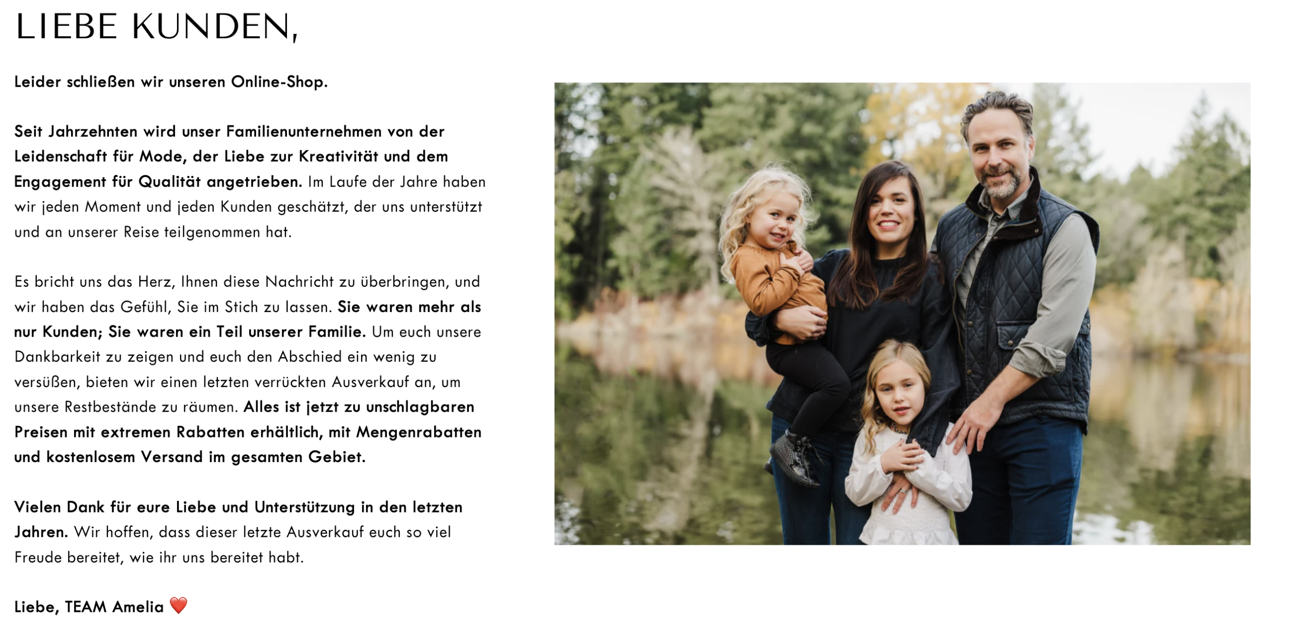 Amelia Zürich versucht, durch die Geschichte einer bevorstehenden Ladenschliessung das Vertrauen der Kunden zu gewinnen: Der Shop behauptet, ein alteingesessenes Familienunternehmen zu sein, das aus finanziellen Gründen schliessen muss. Diese Geschichte ist jedoch frei erfunden, um Kunden mit emotionaler Manipulation zu ködern. Dazu kommen verlockende Rabatte von bis zu 80 %. Solche extremen Preisnachlässe sind generell ein Warnsignal solcher «Fake Shops», wie wir bereits in unserem Artikel «Wie erkenne ich einen unseriösen Onlineshop» vom 22. April 2023 berichteten.