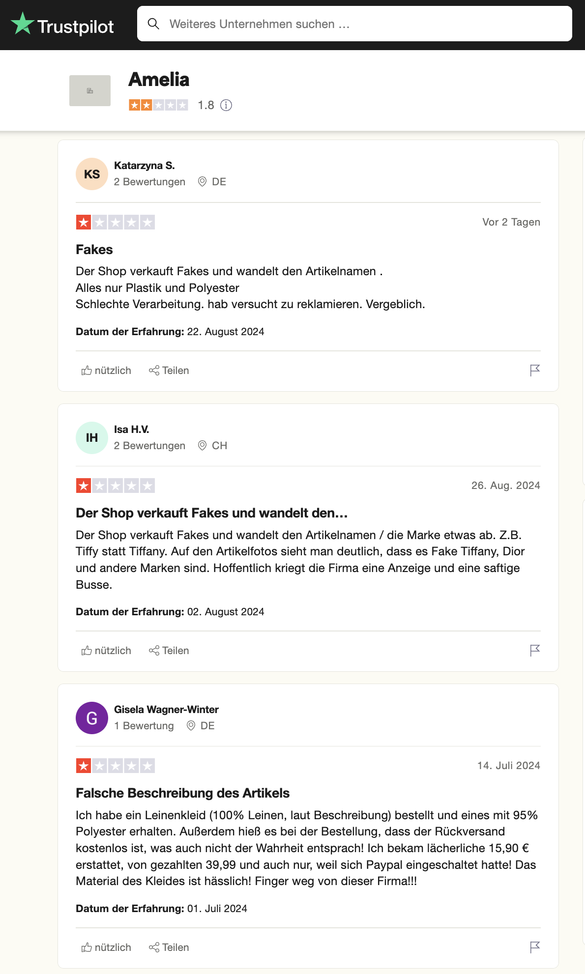 Amelia-Zurich.ch präsentiert auf Bewertungsplattformen wie Trustpilot ausschliesslich positive Kommentare. Diese Bewertungen wirken jedoch stark manipuliert und sind möglicherweise gefälscht, um das Vertrauen potenzieller Käufer zu erschleichen. Seriöse Bewertungen und echte Kundenstimmen fehlen völlig.
